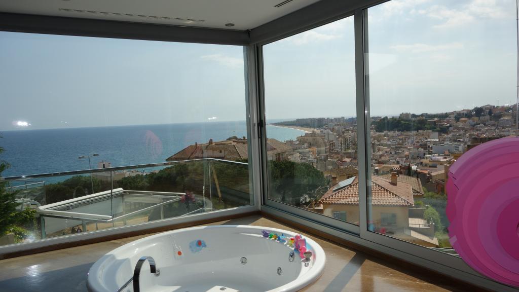 Description:Casa de más de 570 m2, 4 dormitorios, 4 baños, Salon-comedor con salida a terraza,cocina de diseño con isla central,Jacuzzi en dormitorio principal, Fantástica vista panorámica de la bahia de Blanes. Garaje para 7/8 coches. Ascensor calefacción, aire acondicionado, piscina desbordante.